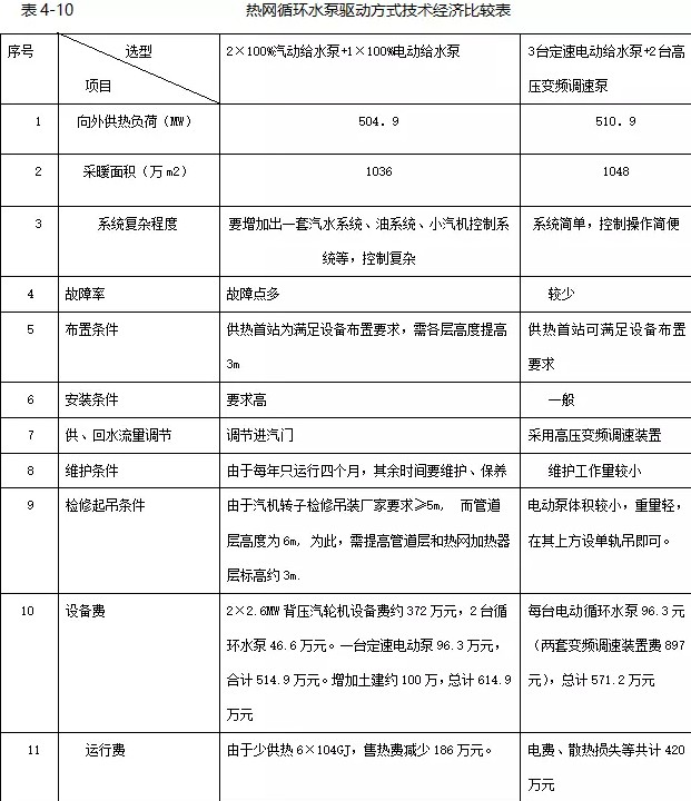 根據(jù)電動和汽動熱網(wǎng)循環(huán)水泵的結(jié)構(gòu)特點,本研究針對兩個供熱首站的內(nèi)部情況進(jìn)行了布置,其技術(shù)經(jīng)濟(jì)比較見表4-10: